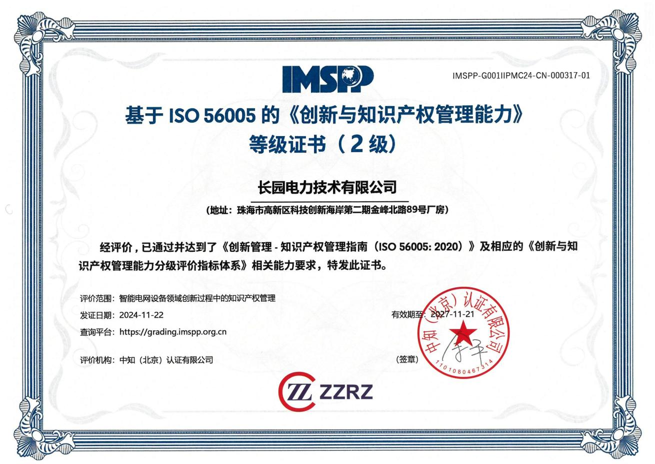 近日,在珠海市与高新区的知识产权主管部门领导班子的带领指导下,710公海寰宇科技集团旗下子公司710公海寰宇电力技术有限公司(以下简称:710公海寰宇电力)顺利获得珠海首批智能电网设备领域国际标准ISO 56005二级认证证书。